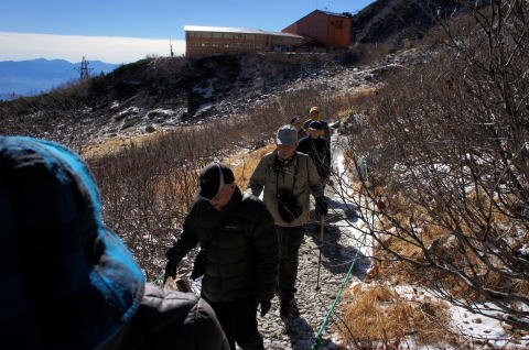 | ロープウエイの高度を上げるにつれて、雲が多くなります。稜線は全く見えません。期待した新雪は降っても融けてしまい根雪になっていません。すこしがっかりです。 | 千畳敷ホテルはロープウエイの終点にあります。紅葉シーズンはとても無理なので、シーズンが終わった月曜日の夜のため、ほぼ貸し切り状態で懇親会を行いました。遅くまで懇親会は盛り上がりました。 |