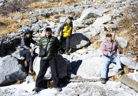 大学に入って間もなく、吉村君に頼まれて一緒に「山の会」の部室を尋ねました。部室は法学部にあり、前年に農大山岳部の「しごき事件」で死者が出た後だったので「一人では心細かった」のでしょう。八ヶ岳の新人合宿、夏合宿で北アルプスを一緒に縦走しました。 今回、四十数年振りに吉村君と一緒に山を歩きました。新兵の二人をしごいた鬼軍曹、一年上の新井先輩も誘いました。 |