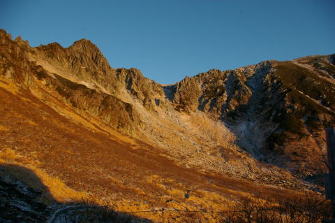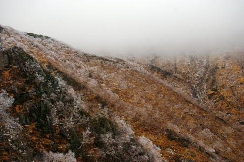 | 歩き出しは凍結していて、良く滑ります。 | カールはすっかり落葉し冬のたたずまいを見せています。少し遅れていますが、ここもあと1週間経つと雪に覆われるでしょう。 |
