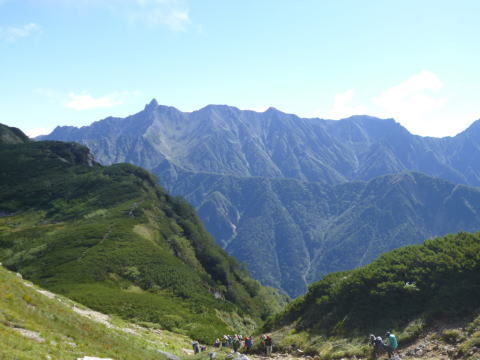 定員88名の笠ヶ岳山荘には249名が宿泊、この夏最高とのこと。私達は十組目位に到着したが、予約をしていなかったので廊下の隅にスペースを割当てられる。夕方到着した人達は廊下の脇にある押入れの中で寝ている。 食堂を寝場所に割当てられた人達は食事が終る夜遅くまで廊下で待たされ、朝は早くから起こされていた。 二日目からは三十人を超えるパーティとも前後しながら歩く。笠新道の下りでも一緒になる。足の踏ん張りが利かなくなった中年男性がいて、ガイドが猿回しのようにザイルで繋いでいた。 (記・豊田紳二) |