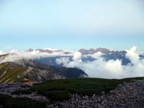 9月15日(月) モルゲンロートの雲を背景に槍・穂高のシルエットがきれいに見える。朝食後、再度笠ヶ岳頂上に向かう。近くの槍・穂高、立山、薬師、御嶽山、白山、南アルプスなど見飽きない。 |
