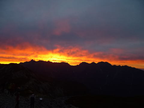 笠ヶ岳山荘にかなり早く着いたが予約をしていなかったので廊下の角のスペースを割当られる。小屋の前のベンチで昼食後、笠ヶ岳頂上に向かう。雲が多かったが北の剣岳・立山、薬師岳、南アルプスまで見える。風が出てきたので下る。強い風と寒さでゆっくりアーベントロートを楽しむことはできなかった。 |