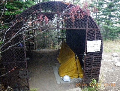 槍ヶ鞘避難雷シェルター 表コースを登り槍ヶ鞘2280mに17:08着。避雷シェルター中でツエルト泊。厚さ20mmの鋼鉄製カマボコに音は反響するがAMラジオ放送は電波シールドされて聞こえにくかった。(夜〜朝の気温7℃) |