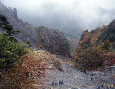 10月1日:(水)晴、新幹線佐久平経由小諸からバスで高峰原車坂峠14:30着。 浅間山の噴火警戒レベルは。2010年4/15に気象庁がレベル2(火口周辺規制)から1(平常)に引き下げ発表をし、小諸市が同年4/17に火口から500m(前掛山)まで登山規制を緩和してきた。ただし、火口から500m以内に影響する程度の噴出現象は突発的に発生する可能性があり火山灰噴出や火山ガス等に警戒が必要となっている。今回の直前(9/27)に御嶽山噴火が発生したこともあってヘルメットとゴーグルを持参した。 |