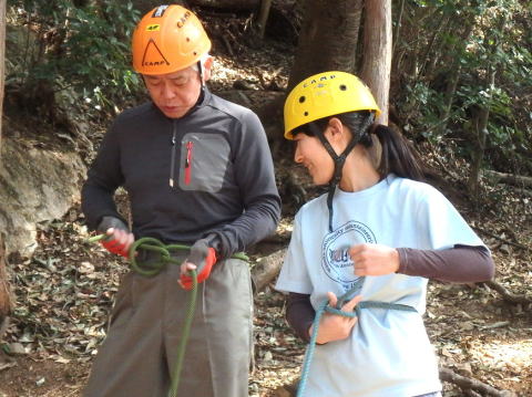 | 亀田OBからトレーニング内容のレクチャーを受ける | 基本的なロープの結び方を研修 |