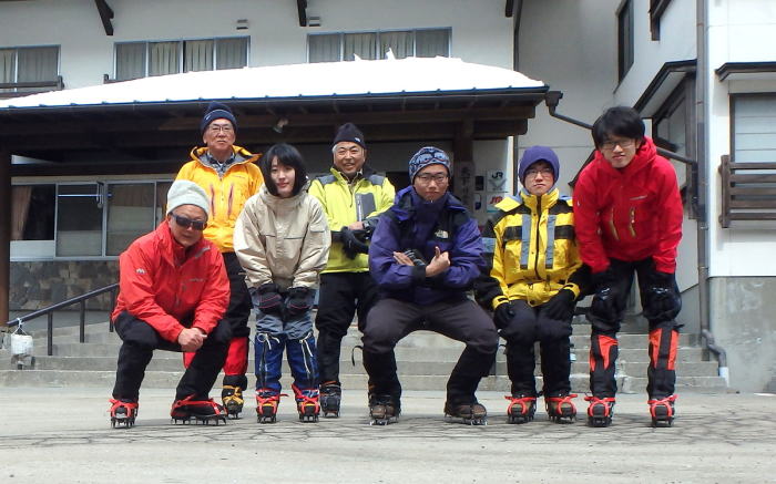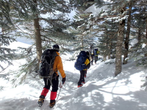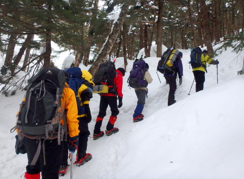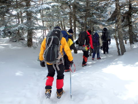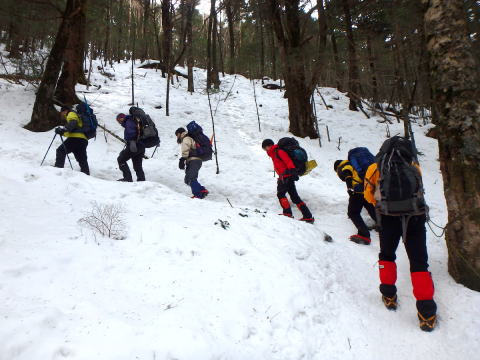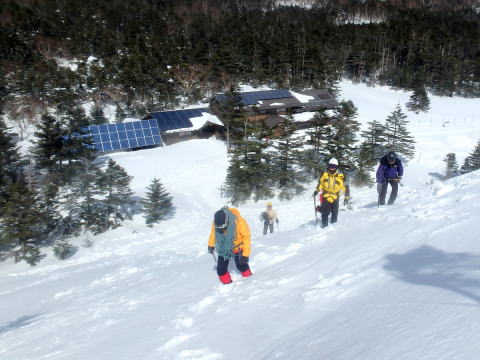 3月15日(晴れ) 8:00~9:30まで天狗ノ奥庭をめぐり、擂鉢池斜面にて滑落停止・トラバース・新雪歩行の練習、岩稜帯にて岩稜歩行、ルートファインディング等の訓練を行い、最後にヒュッテ前斜面にて滑落停止の確認を行う。天幕撤収後、10:25黒百合平を出発し、八方台分岐での小休止を挟んで12:00渋ノ湯着。渋御殿湯の温泉に浸り汗を流す。茅野駅のそば茶屋にて反省会を兼ねて歓談。 |