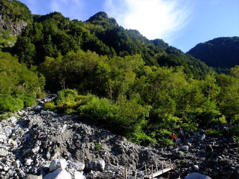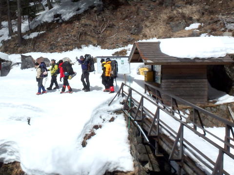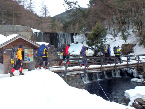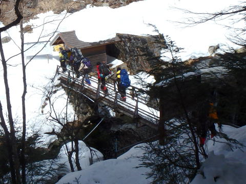 | 午前6時25分、横尾山荘前、いざ出発 | 1時間で本谷橋、70年12月の横尾尾根から高嵐尾根への冬山合宿が思い出される |
