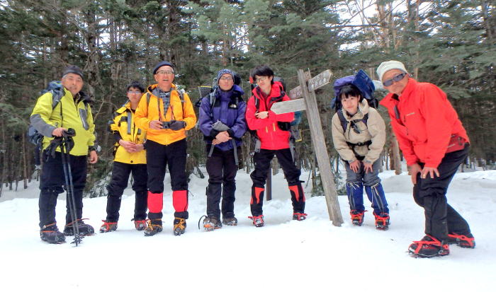 3月13日(曇りのち雪) 11時に茅野駅に集合しジャンボタクシーにて渋ノ湯に向かう。渋御殿湯前で身支度を整えアイゼンを装着して12:15出発。登山指導所ポストに登山計画書を投函し、金子OBトップで登山開始。途中2回の小休止を挟み15:10黒百合平着。天幕設営。OBと腰を痛めている厚木はヒュッテ泊。 |