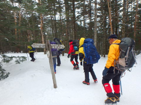 | 歩きやすい雪道を快調に登ります | 八方台分岐に到着 |
