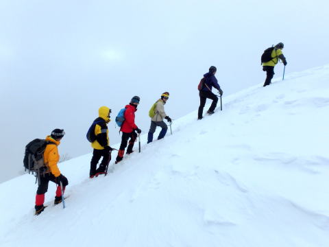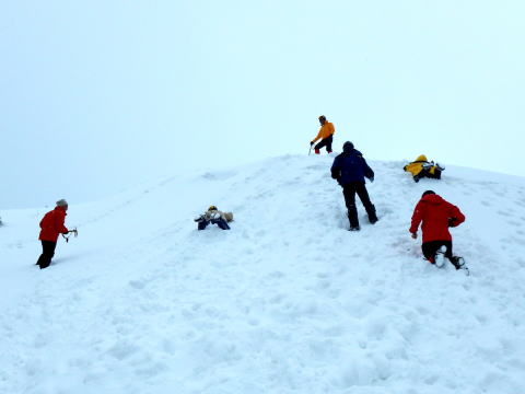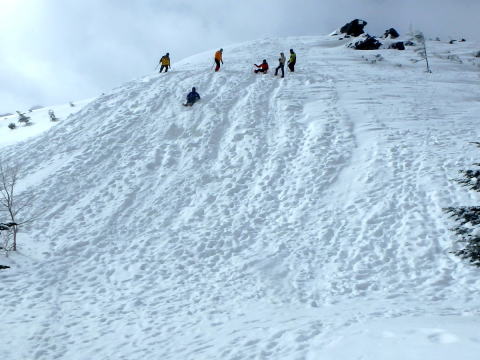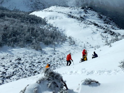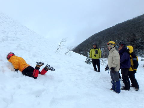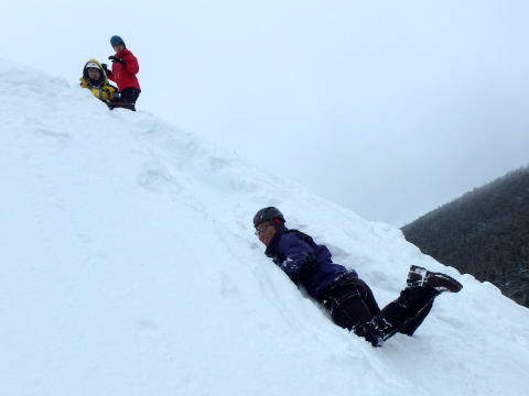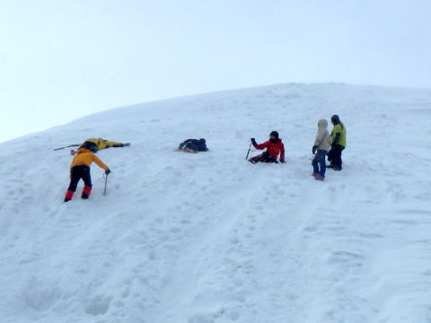 | 摺鉢池から見た天狗岳 | 摺鉢池斜面で滑落停止の練習 |