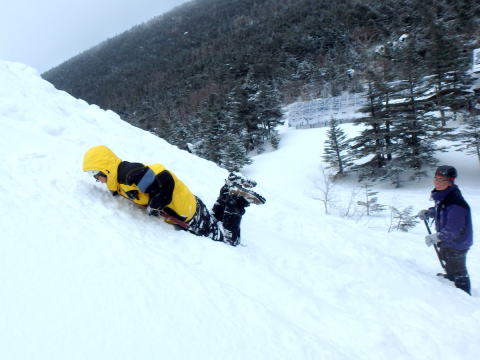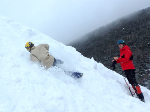 | 厚木さんは2年目なので迫力あります | 頭からの滑落停止にも挑戦です |