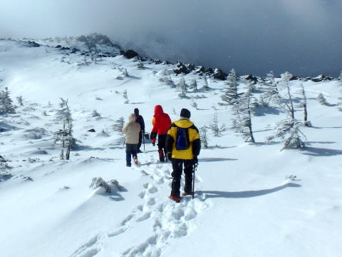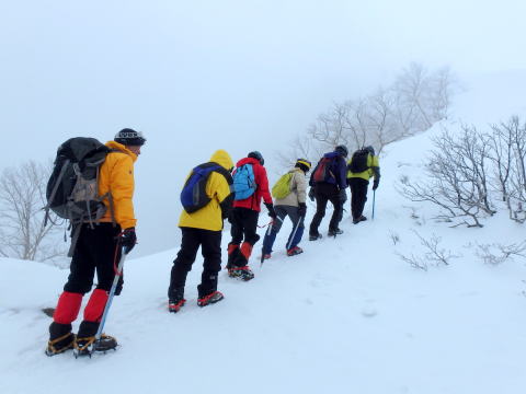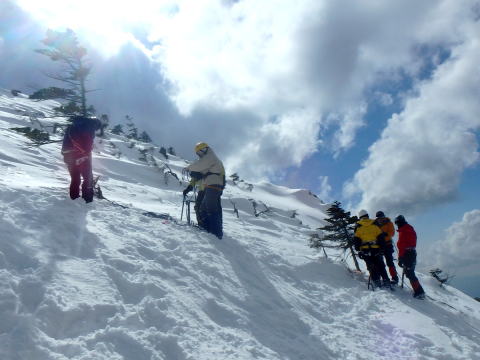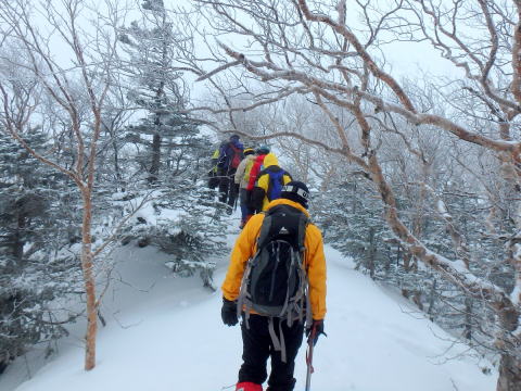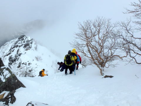 | 稜線を登ります | 左側は雪庇が張り出しているので注意して登ります |