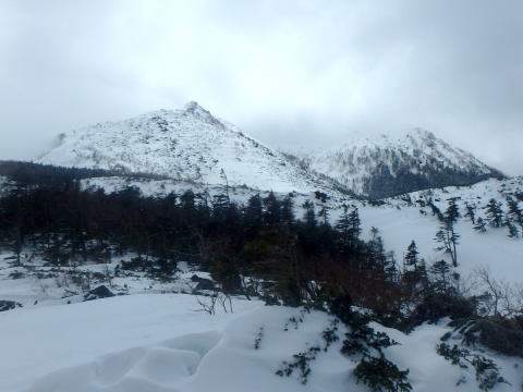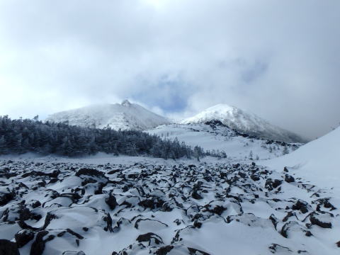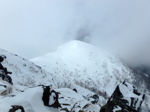 | 下山し始めると少し霧が晴れてきました | 西天狗岳も少し見えてきました |