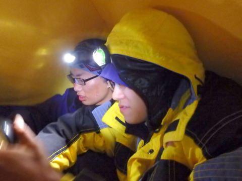 | 慌ててセーター、ヤッケを着込む | 前穂への吊り尾根・最低鞍部、風は相変わらず強く、寒い |