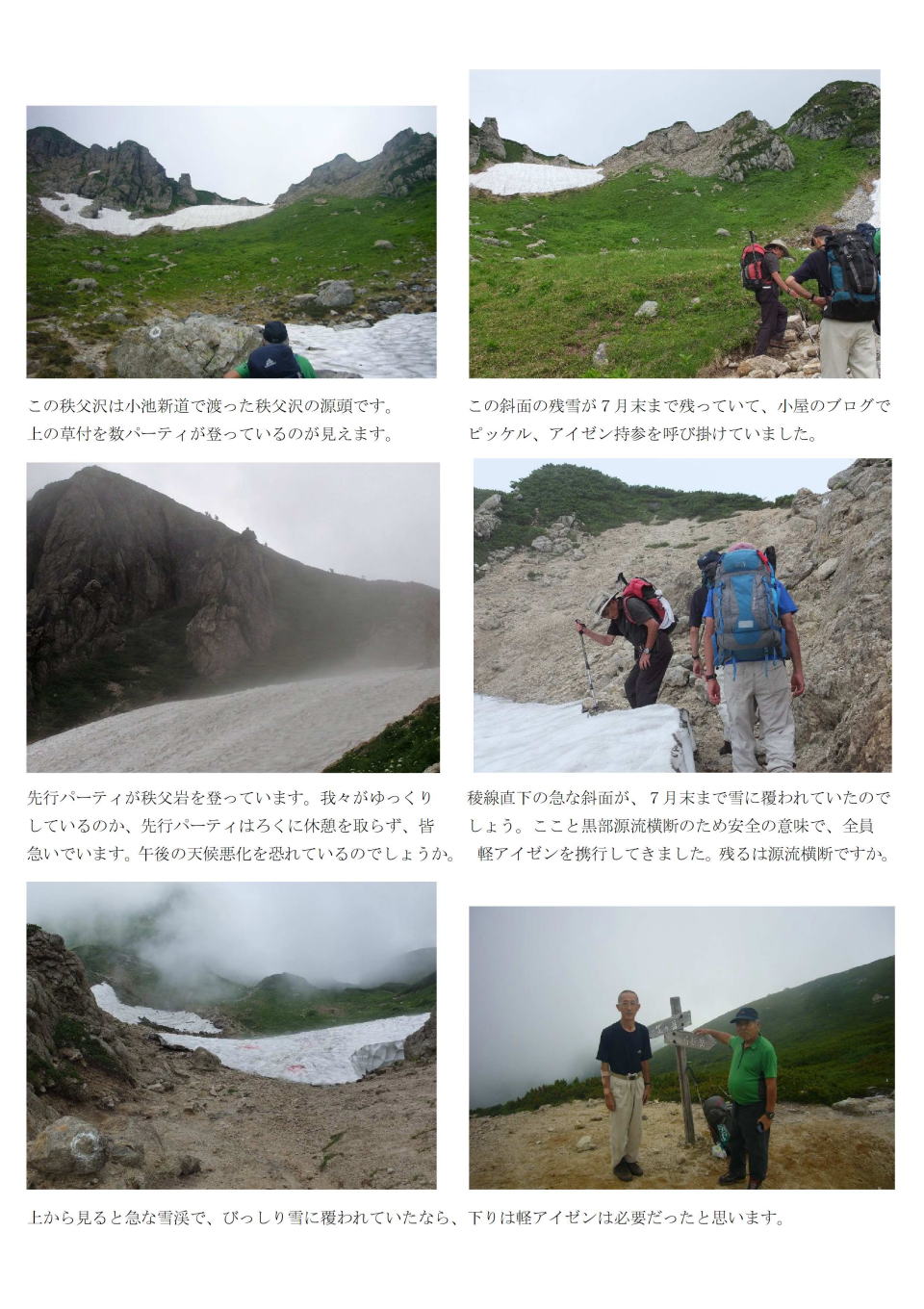 | 紀美子平、風も強く、景色も見えずで前穂ピストンはスキップ | 重太郎新道にて、風の強い吊り尾根を越えてほっと一息 |