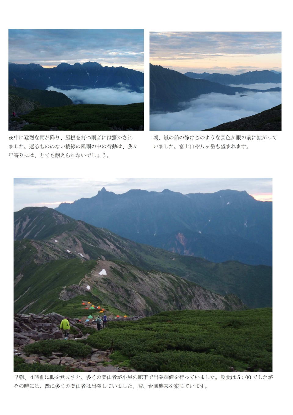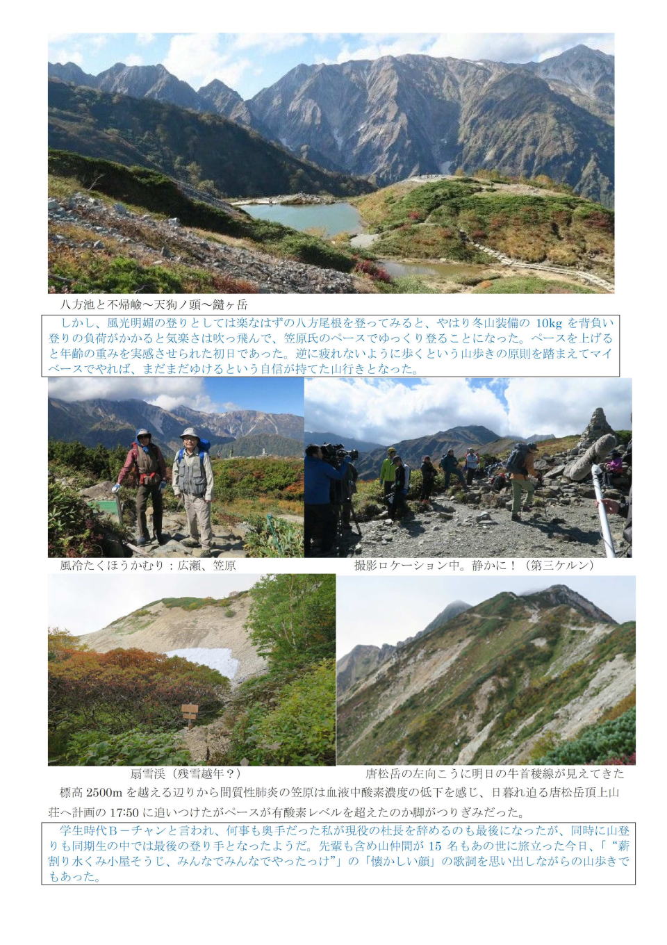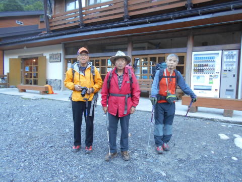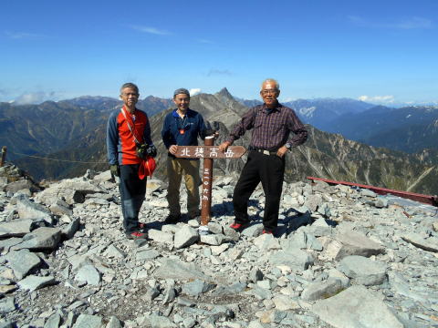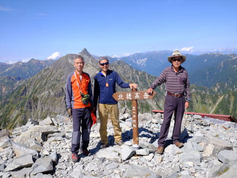 9月17日は一日中、雨の為、甲斐大泉の千露里庵の小屋で一泊し、翌18日に車で沢渡へ。この日は横尾山荘泊。 19日に横尾山荘発6:30で9:30に涸沢小屋着。本谷橋では1970年12月の横尾尾根から野口五郎岳の高嵐尾根への冬山合宿を思い出す。涸沢は紅葉には未だ早い。小屋は時期が中途半端なためか混ではいない。荷物を置いて北穂ピストンに出かける。13:15北穂山頂着。登り3時間、下り2時間。高齢の身には楽ではない。しかし、台風18号一過の素晴らしい北穂からの眺めは、南陵の登りの苦労が吹っ飛ぶ。カレンダー・絵はがきに良くある見慣れた北穂の山頂からの眺めだが、実際に自分の足で登って見るその姿は感動的で何度見ても見飽きない。16:00涸沢小屋帰着。小屋で大塚氏と合流。 |