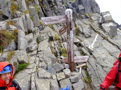 | 8:00奥穂山荘到着、曇ってきた | 奥穂の山頂直下、山頂への登りから風が急に強くなる |