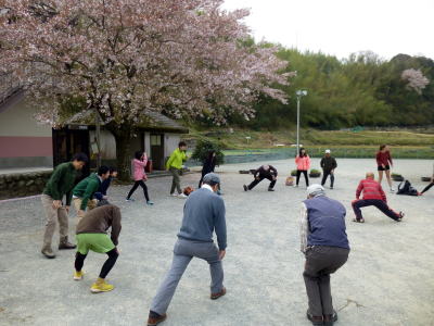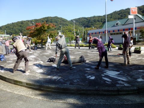 | 恒例の準備体操です。 | 今日のコースはここから沢沿いを歩いて、途中左折して日向山(404m)に登り日向薬師に下山、一回りしてこの付近に戻る軽いコースです。 |