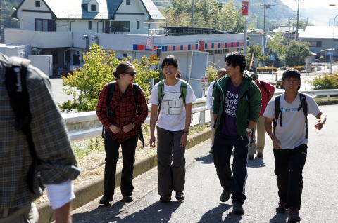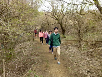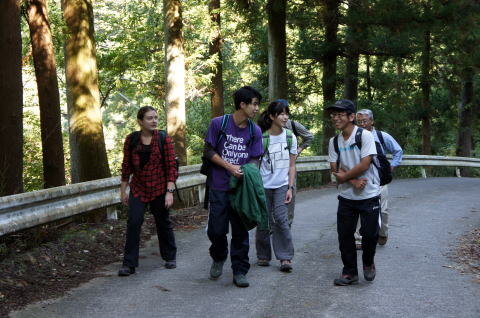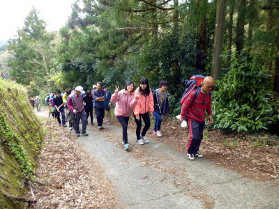 | 車が全く通らない自動車道をのんびり歩きます。 | 学生諸君たちも、お互い会話が弾んでいます。 |