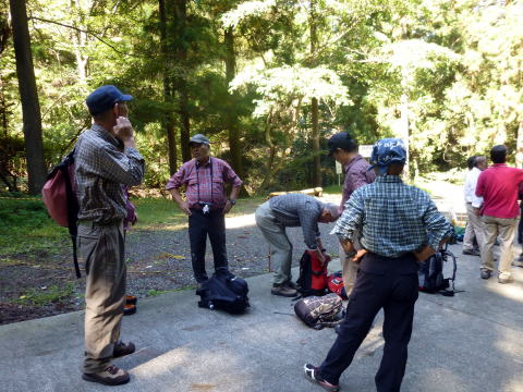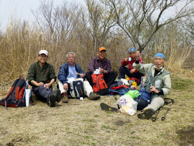 | 福田、斉藤、新井、豊田、笠原OBです。 | 豊田OBも重そうなザックを背負って来ました。 |