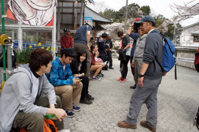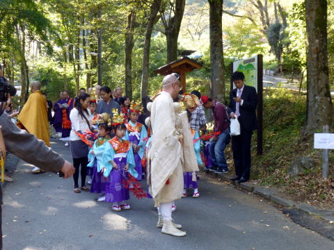 | ここで学生の記念写真を撮ります。みな仲が良いです。ストーバさんは、日本の低い山を堪能したでしょうか。角田君も良い兄貴分です。 | 途中、村中山観音寺に向かう子供たちの行列に出合いました。ポスターを見ると村中山観音寺は天台宗の寺院で、本日が大御縁日で、本尊の開帳日とありました。 |