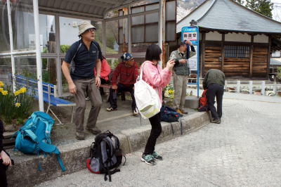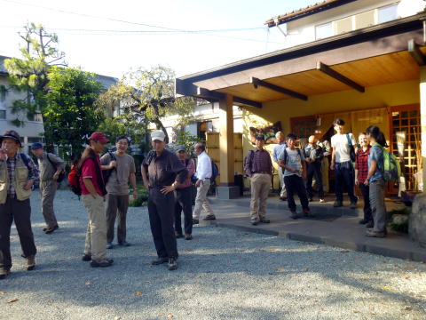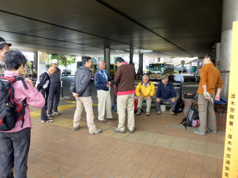 | 本厚木バスターミナルに9:00に集合しました。 | バスを35分乗って広沢寺温泉入口で下車。幹事の斎藤(延)OBの挨拶と自己紹介を行います。 |