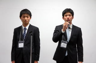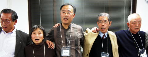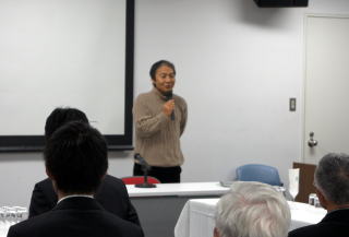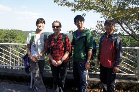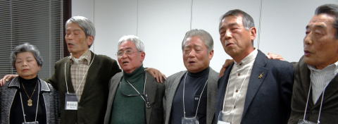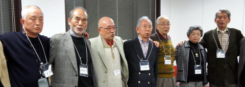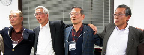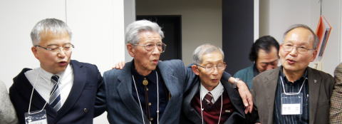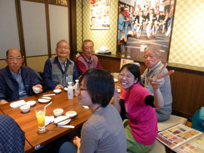 | 学生諸君です。左から今村さんの友人で特別参加のマライア・ストーバーさん(3年)、今村さん(3年)、リーダーの角田君(4年)、真藤君(1年)です。 | OBの方がた。 |