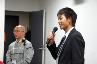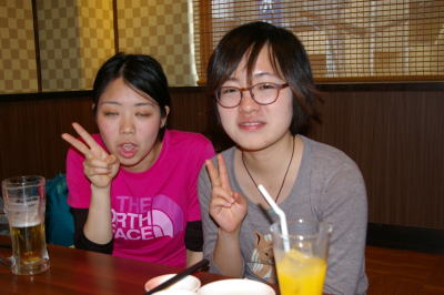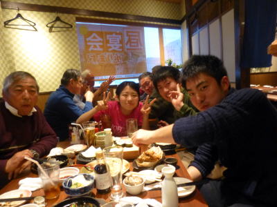 | 空手の松田君と。新歓でブースが隣でした。上田代表が声をかけました。 | 幹事さんご苦労さまでした。あともう少し飲んでください。 |