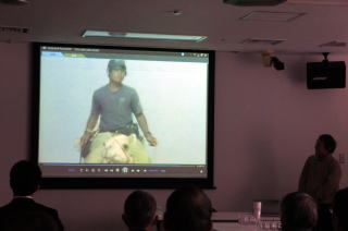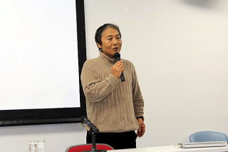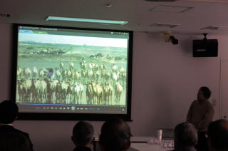 | 豊田役員による関野吉晴氏のご紹介。 | グレートジャーニーの関野吉晴氏の講演が始まりました。氏は武蔵野美術大学の文化人類学教授でもあります。 | 氏のグレートジャーニーは単なる冒険ではなく、アフリカから始まった現代の人類が、世界に拡散して行った長大な道を、自らの力で辿る辿った旅でした。 |