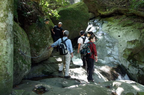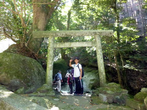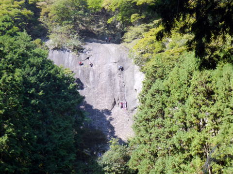 | 突然、沢の対岸に岩場が現れ、練習しています。そういえばバスに外国人のクライマーみたいな乗っていましたが、ここに来たのでしょう。ネットで見ると滑岩、広沢寺の岩場で、最近は流行っているようです。 | 大釜弁財天に着きました。 |