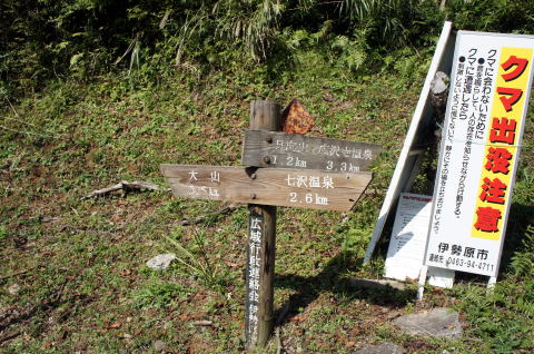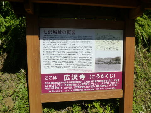 | 前方に見える山が日向山です。意外に登ります。目標が見えることは良い事です。 | この辺りに七沢城址のサインをたくさん見かけます。サインを読むと扇谷上杉氏系の城とのこと。この時代の関東は、足利家の鎌倉公方、古河公方などややこしく、その家宰の山内、扇谷両上杉の抗争も複雑です。そんなことをしているから西から流れて来た、北条早雲に関東を取られてしまうのです。 |